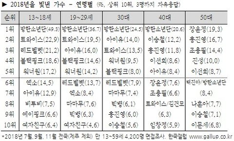 - 2018 갤럽 연예인선호도 조사 전체 1위