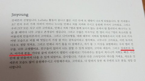 갓세븐 진영이가 2018년 12월 3일에 나왔던 리패키지앨범 Present:YOU&ME 땡스투에 아가새(팬덤 애칭)가 갓세븐의 뮤즈라고 적어줬어
