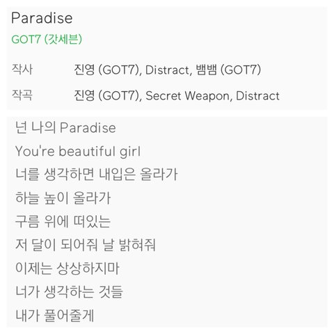 이 노래가 수록된 앨범명이 Flight log : Arrival 인데 진영이가 팬분들과 함께 “파라다이스”에 도착했다는 의미의 곡을 쓰고 싶었대