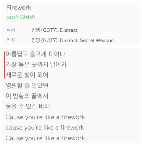 2017년 가을에 나왔던 7for7 앨범 수록곡인 “Firework”도 갓세븐과 팬들에 관한 노래 가사야. 재밌는 점은 가사중에 세로로 읽으면 아가새가 숨어있는 부분이 있어ㅎㅎ