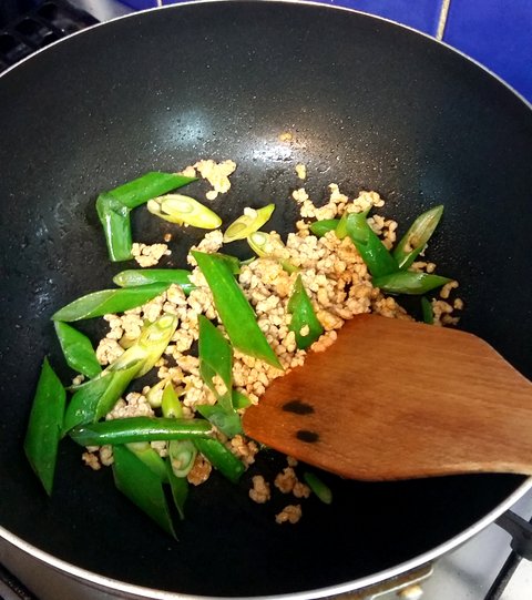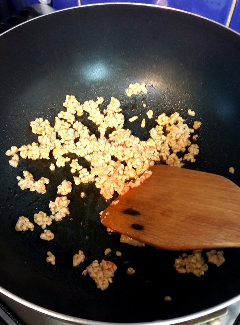 고추기름 1큰술을 두르고 돼지고기 간거를 볶아줍니다. 만일 고추기름이 없으면 일반 식용유