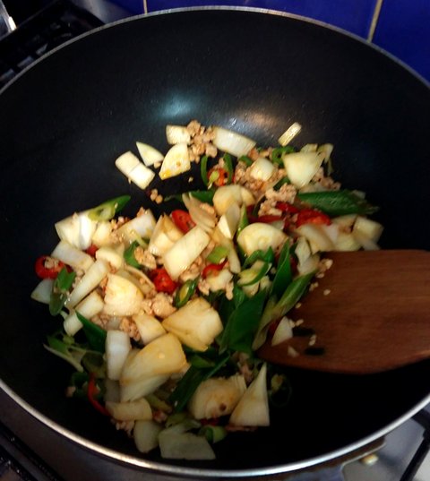 그다음에 바로 양파와 홍고추 청양고추를 넣고 센불에 볶아줍니다.