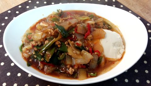 데운 순두부위에 완성한 마파두부소스를 부어줍니다.