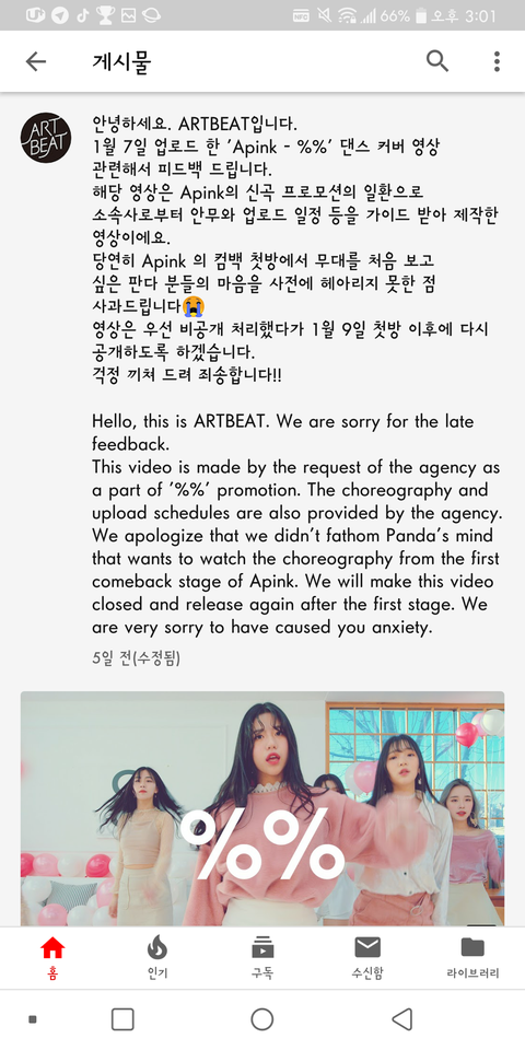 1월 7일에 ARTBEAT라는 댄스 채널에 응응 댄스커버가 올라옴