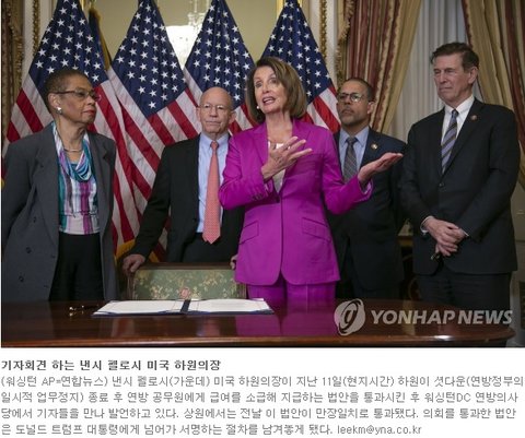 (사진1 설명) 기자회견 하는 낸시 펠로시 미국 하원의장 (워싱턴 AP=연합뉴스) 낸시 펠로시(가운데) 미국 하원의장이 지난 11일(현지시간) 하원이 셧다운(연방정부의 일시적 업무정지) 종료 후 연방 공무원에게 급여를 소급해 지급하는 법안을 통과시킨 후 워싱턴DC 연방의사당에서 기자들을 만나 발언하고 있다. 상원에서는 전날 이 법안이 만장일치로 통과됐다. 의회를 통과한 법안은 도널드 트럼프 대통령에게 넘어가 서명하는 절차를 남겨놓게 됐다. leekm@yna.co.kr