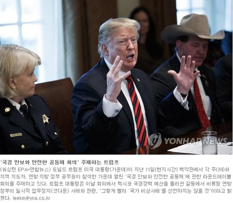 (사진2 설명) '국경 안보와 안전한 공동체 회의' 주재하는 트럼프 (워싱턴 EPA=연합뉴스) 도널드 트럼프 미국 대통령(가운데)이 지난 11일(현지시간) 백악관에서 각 주(州)와 지역 지도자, 연방·지방 정부 공무원이 참석한 가운데 열린 '국경 안보와 안전한 공동체'에 관한 라운드테이블 회의를 주재하고 있다. 트럼프 대통령은 이날 회의에서 멕시코 국경장벽 예산을 둘러싼 갈등에서 비롯된 연방정부의 일시적 업무정지(셧다운) 사태와 관련, "그렇게 빨리 '국가 비상사태'를 선언하지는 않을 것"이라고 밝혔다. leekm@yna.co.kr