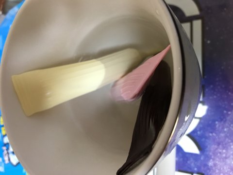 일단 초코가 굳어있는 상태니까 뜨거운 물을 받아서 퐁당해줌 그리구 한 20초동안 기다리다가 빼줌 너무 오래있으면 튜브 터지고 물이 안으로 들어가면서 얼초를 맛있게 먹는 방법에 실패함