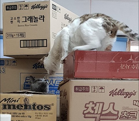 콩이 박스에서 떨어지고 흰둥이가 '승'