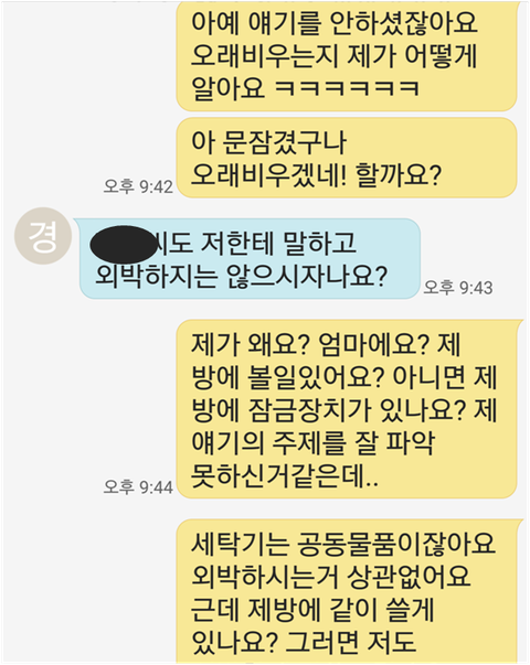 1. 자기가 이번에 휴가를 가는데 지 방 문을 잠그고 가겠다한거임 그때 휴가가 4일인가? 그랬음. 여직원은 이건 아니라며 왜 방문을 잠그고 가냐고 그럼 세탁기를 못쓰지 않냐고 뭐라고 했는데 나는 알겠다고 함. 어차피 휴가라는게 일회성이지 않음? 그래서 당연히 한번인데 그럴수도 있겠거니 하고 이해해주자 함.