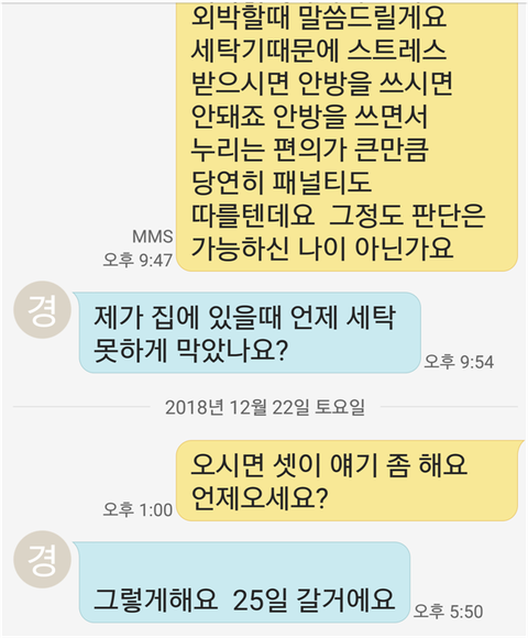 "대리님이 안방쓰시잖아요. 화장실도 있고 방도 제일 크고. 그리고 세탁기가 있잖아요. 그러면 공동으로 세탁기를 쓰는걸 감수하면서 선택하신거 아니에요? 그게 싫으시면 안방을 쓰면안되죠"