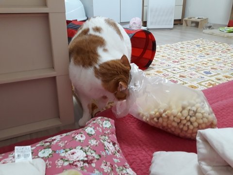 집사인 나는 누워서 티비를 보며 강냉이를 먹고 있었음.