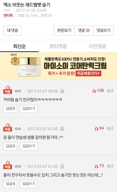 슬기 카이 연습생몇년한 친군데 ㅋㅋ 민호도 스엠오래있어서 친하고ㅋㅋ 비웃는게 아니라 그냥 저 무대장치 등이 웃겨서 웃는거지 조작질좀 그만해라 이거 2년 이상 된거고 당시 엑셀들 아무도 안깠음