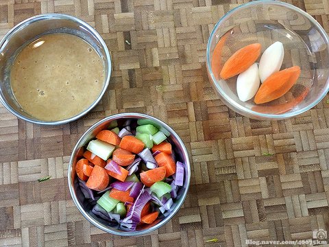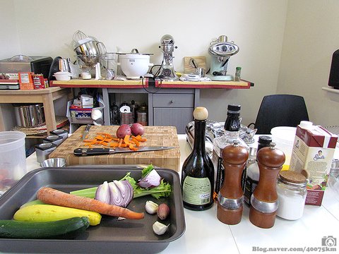 냉장고에서 나온 고기의 찬 기운도 좀 빼줄 겸, 고기는 마리네이드한 채로 놔두고 다른 재료를 손질하기 시작합니다.