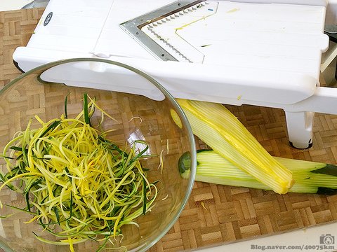 애호박과 주키니(애호박과 비슷하게 생긴 노란색의 미국 호박)를 잘 씻어서 껍질 부분만 슬라이서로 썰어냅니다.