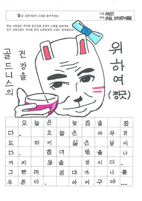 '잘생기고 멋지고 귀엽고 지적이거 키크고 애교넘치고 섬세하고 꼼꼼하고 든든하고 믿음직하고 정직한 막내 보민이가'