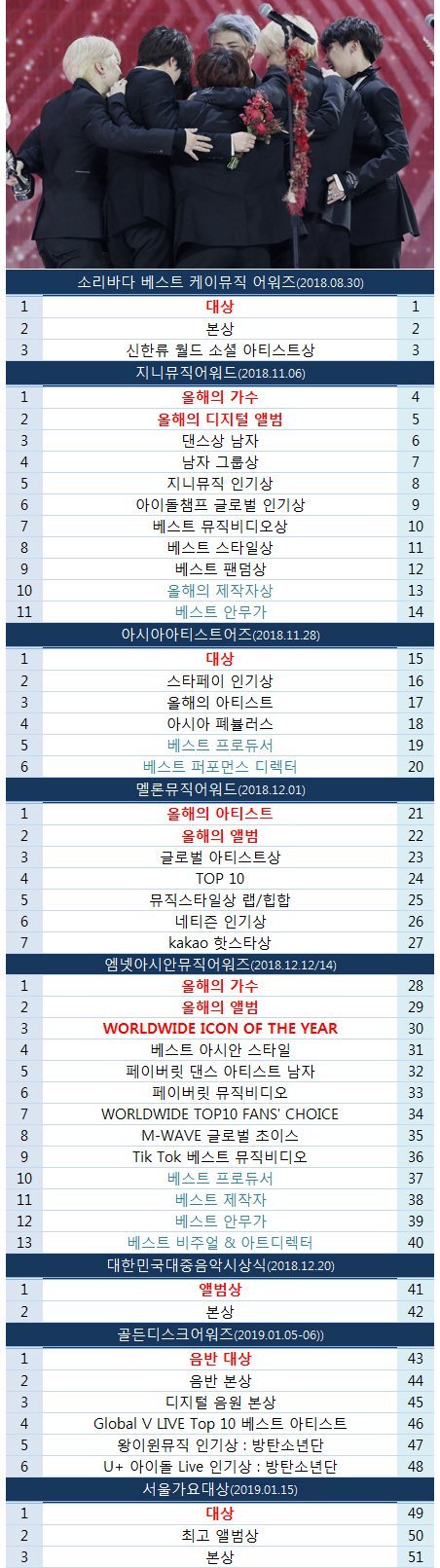 와 국내 시상식에서만 대체 몇개야? 저기에 안들어간 상도 많잖아 무슨 협회나 언론사 상부터 훈장까지ㄷㄷ 해외 시상식 까지 하면 백개 무조건 넘을듯 작년초에 탄이들이 뭐가 힘들고 두려웠는지 알거같아 무게감이 확 느껴지네ㅠ