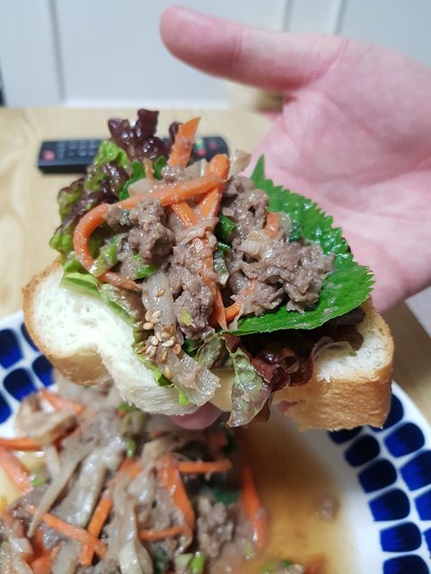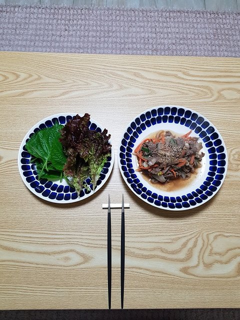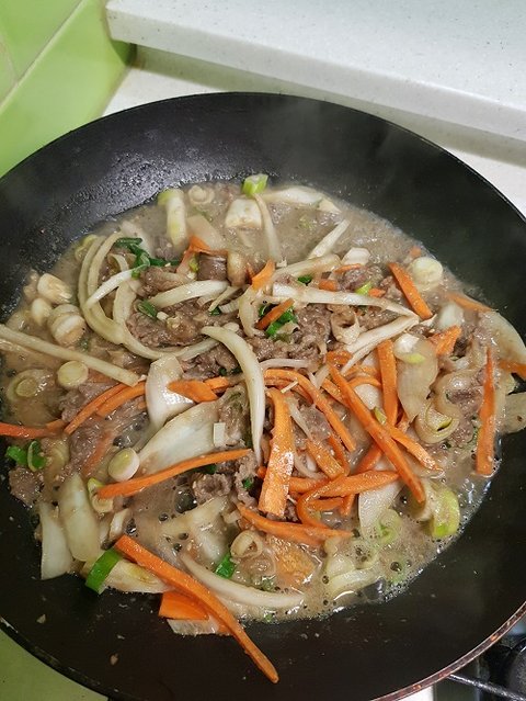퇴근하고 오니 배가 헛헛해서 밥은 없고 소불고기 양념해둔 거 볶아서