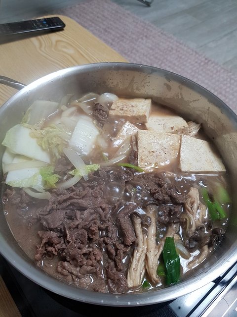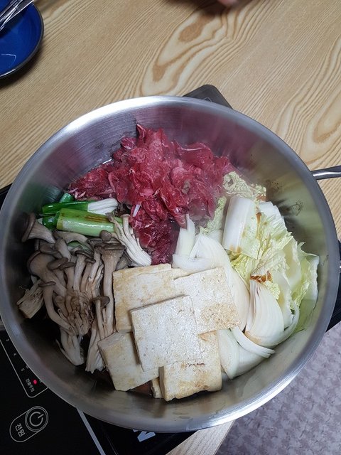 육수 우려내고 두부도 한번 부쳐서 쯔유넣고 스키야키를 만들어보았습니다.