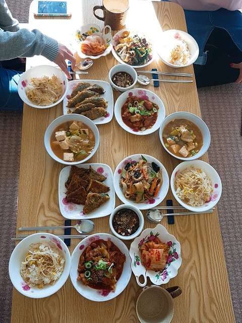 콩나물 밥 하고 잡채랑 모듬전 그리고 된장찌개, 닭볶음해서 나눠먹었습니다.