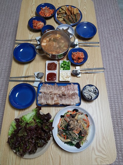 돼지고기도 삶고 잡채도 만들고 전도 굽고 생굴도 준비해 상추쌈도 싸먹었습니다.