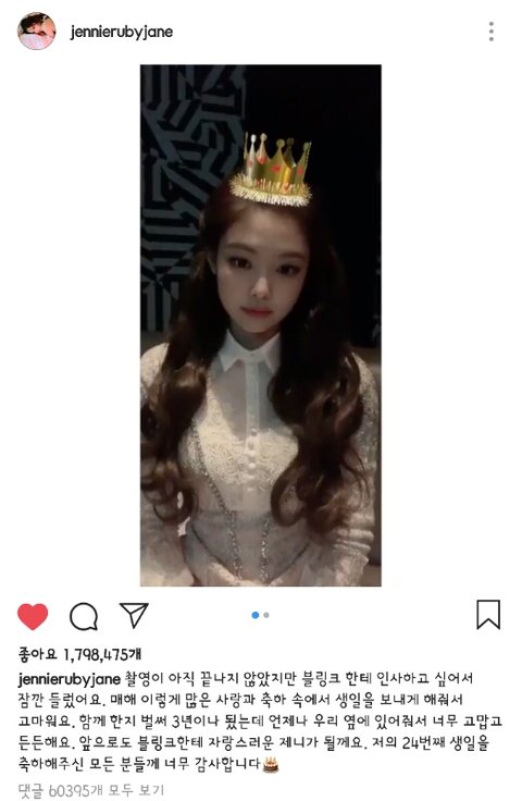 지수는 제니 열애설 터지고 이틀 뒤에 생일이라 티도 못내고 조용히 지나갔는데 정작 자기는 요란하게 보낸거 인스타에 엄청 티내네... 지수는 팬들이 선물해준거 인증샷 딱 하나만 올리고 팬들에게 감사의 표시를 함. 근데 제니는 샤넬이나 헤라에게 받은거 올리고 내가 아직도 제일 잘나간다고 주입시키려는거 같아서 비호감이야 멤버들만 불쌍하지 쟤때문에 지수생일 조용히 지나간거 지금 생각해도 짜증나는데 한줌 제니팬들이 영업을 해대니까 더 비호감이라고