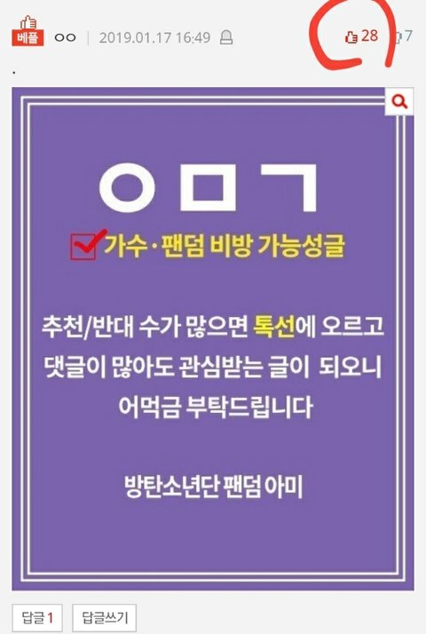 글 묻히게 하려고 애쓴다 아미들 ㅋㅋ 쉴드칠 것도 없으니 어쩜... 조작은 베댓>글 순으로 하나보네? ㅋㅋㅋㅋ 게다가 베댓 세 개 추천수도 다 똑갘아 ㅠㅠ