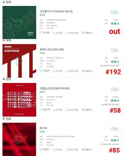 2. 아이콘 그룹이나 각 멤버의 인지도가 낮기 때문에 음원 성적이 안정적이지 않음. 1년에 4번씩이나 컴백을 했음에도 불구하고 고무줄다리기, 죽겠다, 그리고 I'm ok 까지 성적이 저조함.