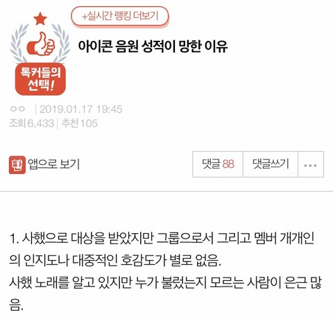아이콘보다 음원성적 안정적으로 좋은 선배님들(엑소 방탄 빅뱅 위너 등등)이 많이 계시지만 아직 아이콘이 그분들에 못 미친다고 망했다고 하는것은 적절하지 않습니다.