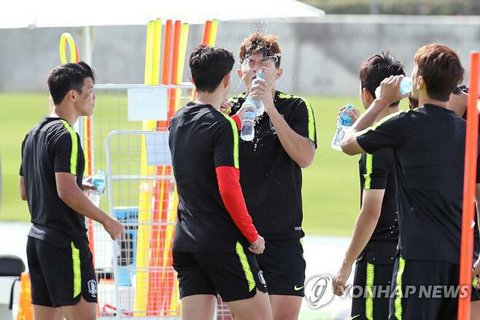 파울루 벤투 감독이 이끄는 축구 국가대표팀 손흥민(왼쪽)이 18일 오전(현지시간) 아랍에미리트 두바이 NAS 스포츠 컴플렉스에서 훈련 도중 김민재 선수에게 장난으로 물을 뿌리고 있다.