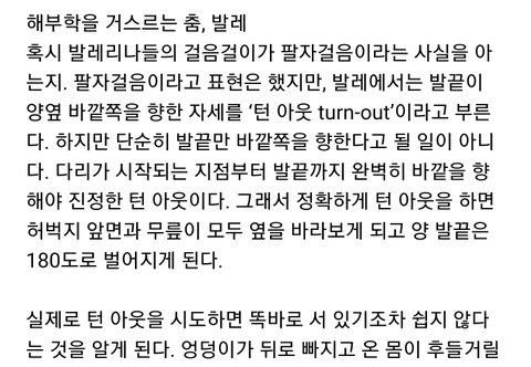 일반인들이 턴아웃 동작을 흉내는 낼수 있을지 몰라도 녤처럼 양발을 꺾은채 허벅지, 무릎 전혀 안구부리고 하는건 힘들다고