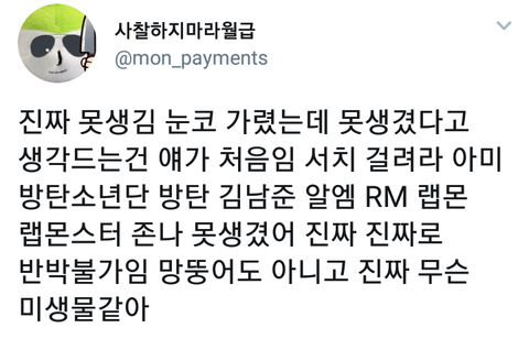 대표적으로 방탄이라 적어뒀긴하지만, 저기 남돌 정말 죽을듯이 까는건 반박 못하잖아 그지? 남돌까는글 틧하면 알티만 몇천이고 인용알티해서 더 조롱하는게 일상인거 알잖아?내가 본 내본진 얼평글만 몇개인지^^ 제발 남돌좀 잃어 얘들아ㅜㅜ