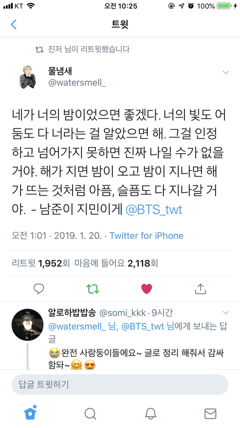 남준이라는 리더가 있어서 너무 고맙고 다행이라고 생각 해 ㅠㅠ 멤버 한명 한명 힘들때 마다 겉에서 지켜봐오고 겉에 있어주고 힘들때 제일 힘 되어주는 행동이 겉에 있어주는게 어느 것보단 힘 되더라 주변에 누구라도 있다는게 그리고 나 혼자 아니라는거에 얼마나 힘이 나는지...(주절리 적어봤어) 미안해 그리고 보라해
