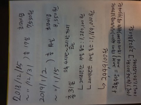 본인은 가게를 5시에 열어야 하기 때문에 4시 반 정도에 출근을 하였고, 가게는 12시까지 이지만, 새벽 1시까지 손님이 있다면 그 시간까지는 손님을 받으라는 얘기를 하였습니다. 그래서 1시에 마감을 시작하면 보통 2시 반정도 까지 일을 마쳤습니다. 그러한 점을 고려하여 4시반~2시반까지를 평균이라는 가정 하에 최저임금을 계산했습니다. 2018년도에는 17일동안 출근을 하였고, 2019년도에는 14일간 출퇴근을 한 31일간의 내역을, 최저임금으로 계산을 하였습니다. 2018기준 7530원에 주휴수당 포함하여 실질적 시급 8390원, 그리고 2019년 최저임금 8350원에 주휴수당 포함하여 실질적 시급 9304원을 계산했습니다. 거기에 재료비 25만원 상당 역시 제가 가게에 투자한 비용이니 청구하는게 맞다고 생각하여, 그것 까지 내역을 정리했고, 총 받아야 하는 최저임금이 2백7십2만원에 상당하는 금액이었습니다.
