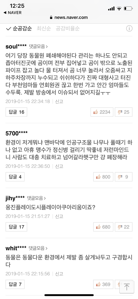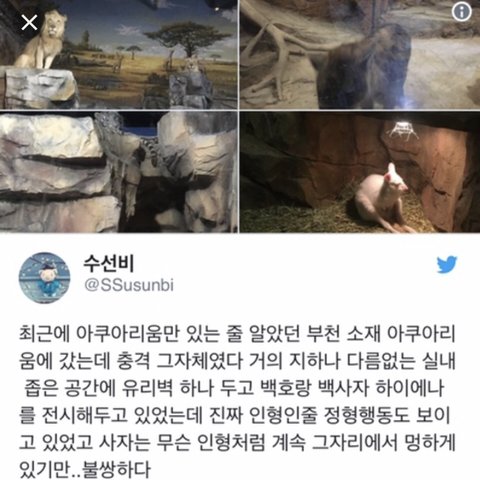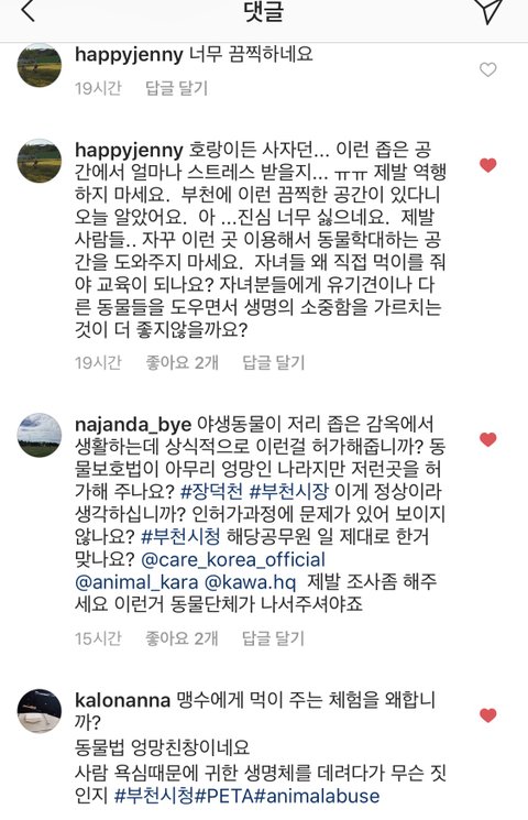 이 곳 말고도 제주도에서 돌고래쇼로 학대받는 돌고래들이며 다른 동물원에서도 열악하게 살고 죽어나가는 상황이 많습니다. 동물원은 누구를 위한 공간일까요. 동물들을 위한 공간은 분명히 아니며 사람들의 생태적 감수성도 퇴보시킬 뿐 입니다.