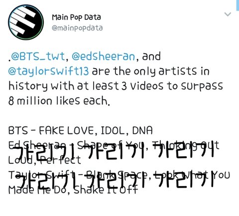 너튜브 8백만 좋아요 돌파한 영상이 3개인 가수가 방탄이랑 퉤일러 스위푸투님이랑 에드쉬런님만 유일하대!