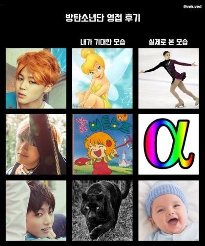 실제로 보면 민슈가랑 이미지가 반대...오히려 슈가가 더 귀염상이고 지민이가 더 차가움ㅋ 진짜 당황스러울정도. 실물을 몹시 근접해서 본 1인으로 의견을 말하자면 실물갑은 진. 진은 사진도 잘생겼지만 그 사진이 실물을 반도 못담음. 진심 개놀람. 제이홉은 사진이 못나오는 수준이 아니라 그냥 다른 사람인 정도. 정국인 사진보다 더 뽕양뽕양 똘망똘망 아기사슴 아이돌력 만랩. 뷔는 알다시피 사진처럼 인형같이 생기고 아렘은 생각보다 비율이 미쳐서 모델같음. 결론은 실물은 다들 훨씬 마르고 잘생김. 누가 얼굴로 까는건지ㅋ