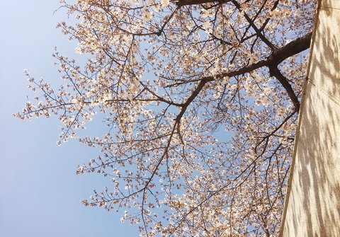 햇볕이 내려쬐고 벚꽃이 활짝 핀 거릴 걸으면