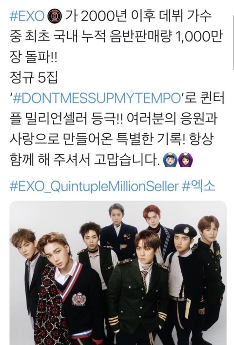 엑소가 지금까지 걸어온 길들 기록과 역사는 쟤네들이 아무리 물어뜯어봤자 안 사라져 사실이니까 3세대 아이돌의 형태를 만들었고 3년이상 대상받은 가수 엑소가 최초고 5년연속 수상절대 무시할 수 없는 기록임 또 mp3로 넘어가는 시기에 12년만의 밀리언셀러를 달성하면서 앨범경쟁의 시대를 만든것도 엑소고 그러면서도 음원성적도 상위권 그리고 다들 알다시피 팬덤대통합도 이뤄내고 난 엑소가 3세대를 연 가수로서 엑소가 만든 형태안에서 경쟁하고 있다고 생각함 그리고 엑소는 현재진행형이라는게 젤 소름돋는 사실이고 더 많은데 간략하게 써 봄