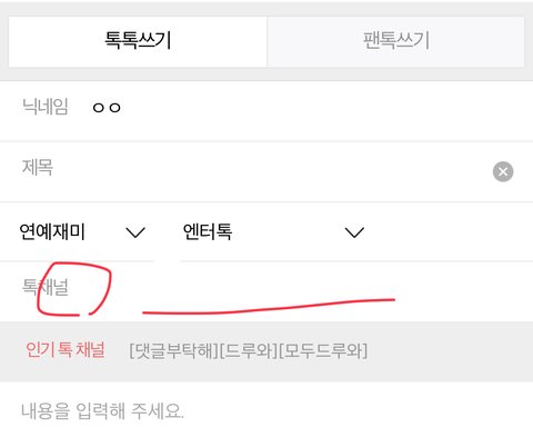 엔터에 글 쓸 때 톡 채널 꼭 입력해줘! 일단 먼저 연예재미 엔터톡 카테고리인지 확인 해주고