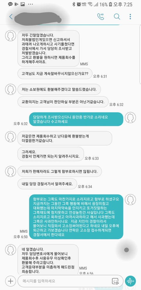 이사람은 당당히고소하라고 얘기하는데 들어보면 본인은 책임지고 교환해주려고 했고 회수후 환불해주겠다는데 무슨잘못이냐,,,