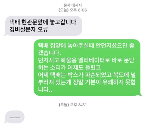 어제 택배는 박스가 파손되었고 복도에 널부러져 있는게 정말 기분이 유쾌하지 못합니다..”