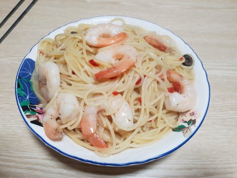 원래 마늘, 페페론치노만 들어간다고 알고 있지만 냉동실에 있던 새우까지 합세하여 만들었어요