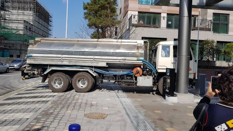고심끝에 살수차를 동원에서 밖에서 뿌림