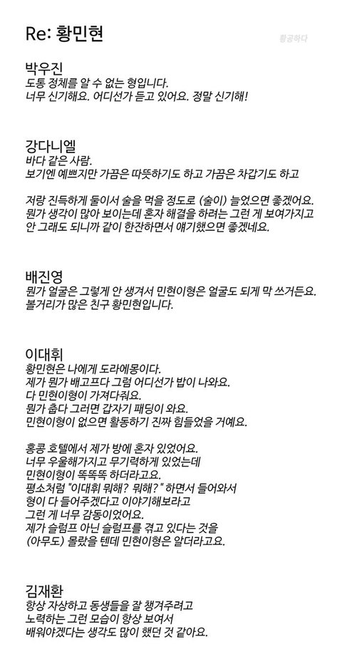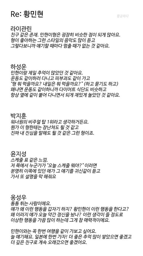 오늘 콘서트에서 re:황민현 이라고 워너원 멤버들이 민현이를 어떻게 생각한지 말한거란 말이야.. 근데 거기서 어린애들에게는 장난스럽게 대했다고 하고, 또 어떨 때는 진지하게 고민들어 줬다는 멤버 피셜듣고 진짜 마음이 따뜻한 사람인걸 알았어 ㅠㅠ
