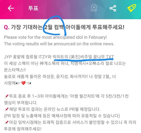 확실하진 않지만 아이돌챔프앱 깔아서 2월달 컴백 아이돌 투표하자!