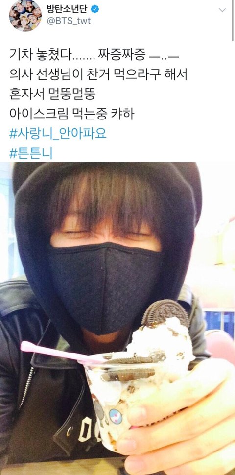 다음날 제이홉이 광주 가는 기차를 놓치고 아이스크림을 먹고있다. 의사선생님 말 잘 듣는 착한 어린이.
