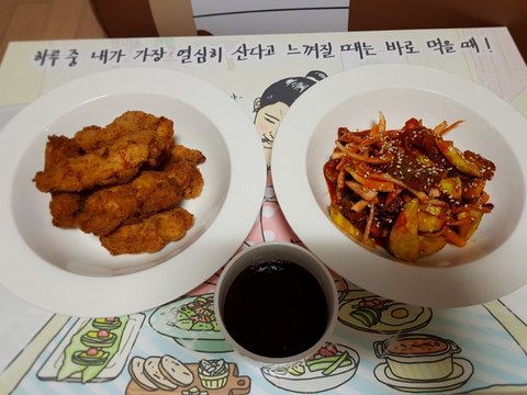 닭안심 밑간해서 튀기고. 골뱅이무침좀했답니다~