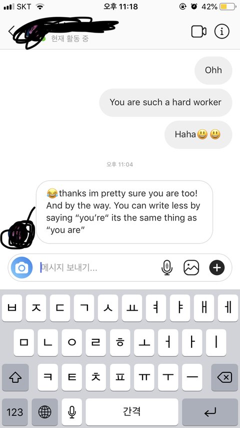 내가 너 정말 성실한 사람이당!! 이러니까 하하 너두 그런거같애 그라고 you are을 you’re 이라고쓰면 같은 뜻이지만 ㅇ렇게 쓰면 덜 쓸 수 있엄 이렇게 말했거든?? 근데 어떻게 말해야될 지 모르겠어 그낭 나 이미 알고있어 하하 I already knew it haha 이렇게 보낼까 약간 싸가지 없어 보이지 않어?? 근데 사실 이미 알고있는데 you’re 치는게 더 귀찮거든 근데 솔직히 u r 이라고 치고 싶었는데 계속 you are 이라고 친거였걸랑 ㅜㅜ