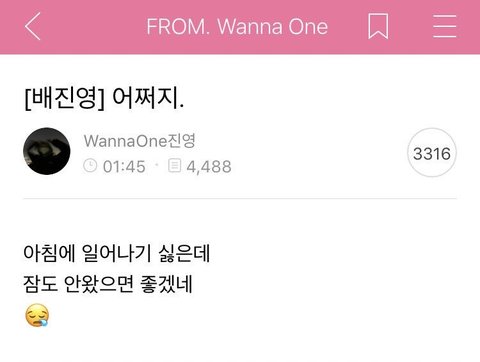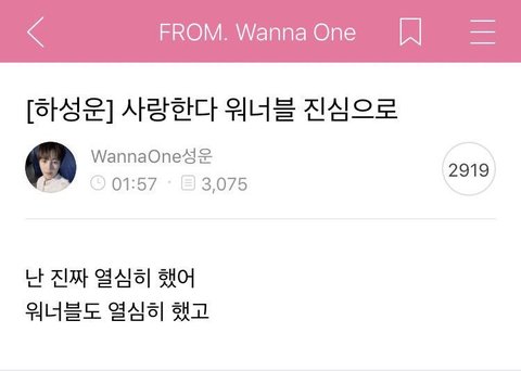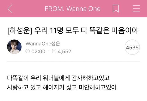 짧다면 짧고 길다면 긴 1년 6개월 처음 만난 봄부터 함께 시작한 여름 외롭지 않았던 가을 따뜻했던 겨울 이젠 혼자 맞이할 사계절 너희를 기다린다는 생각으로 마주할게 내 마음 속에서 우리한테 너희 열한 명은 어디서 누구와 어떤 모습을 하고 있건 간에 워너원 그 자체니까 사랑했고 사랑하고 사랑할 거야