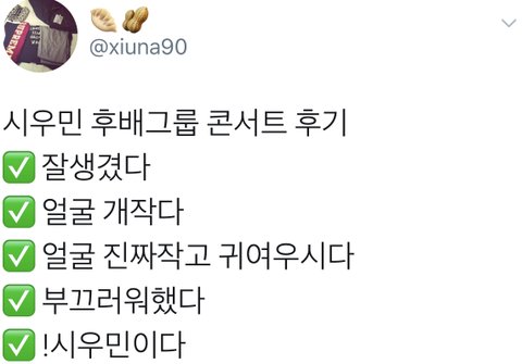 시우민 후배돌 후기들마다 얼굴 작다 소멸할것같다는 말이 빠지지 안잖아여 같은 연예인들 사이에 있어도 작고 예쁜 콩알요정이라능ㅠㅠㅠ